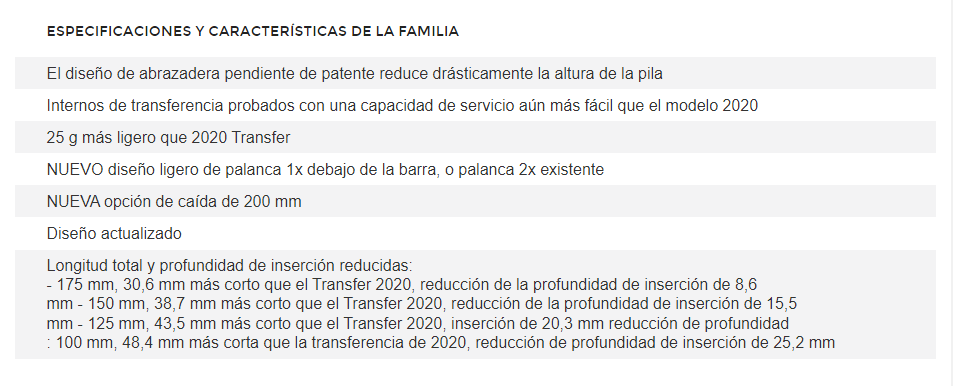 La tija de sillín Transfer es más ligera y ajustada que nunca. Menos peso, longitud reducida y profundidad de inserción reducida significa un mejor ajuste en más marcos. La durabilidad mejorada y la facilidad de servicio significan más conducción y menos tiempo de inactividad. Disponible con hasta 200 mm de caída, Transfer está listo para enfrentar los terrenos más desagradables.